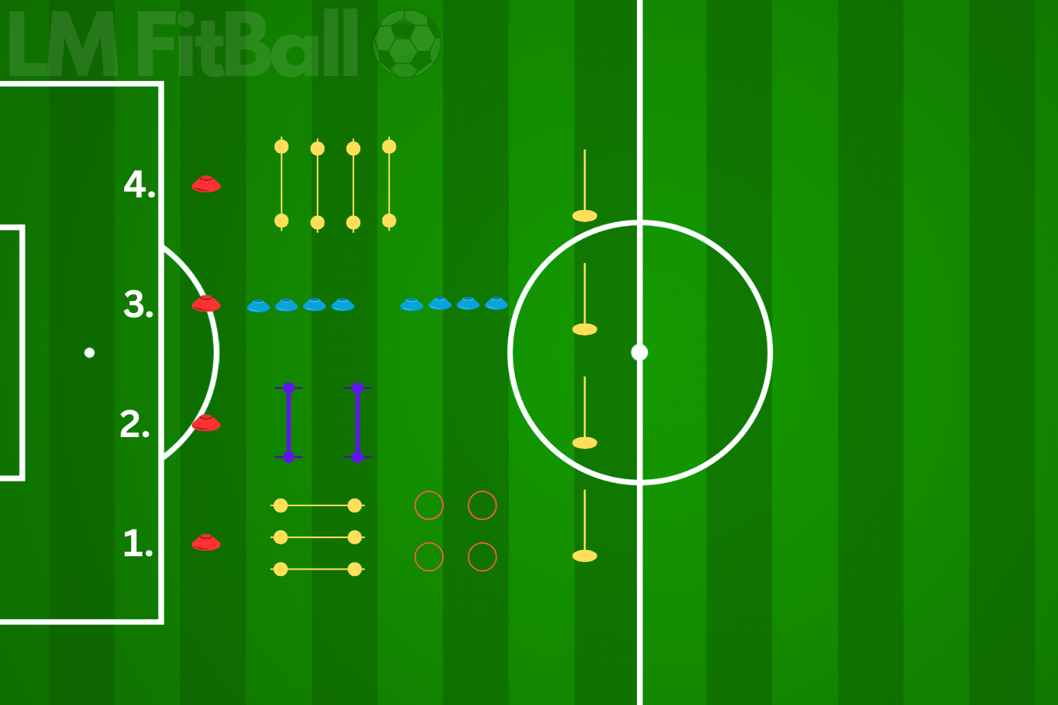 aufgeteilt in 4 Gruppen á 4 unterschiedliche Läufe, gefolgt von 5m auslaufen und zurück: